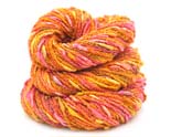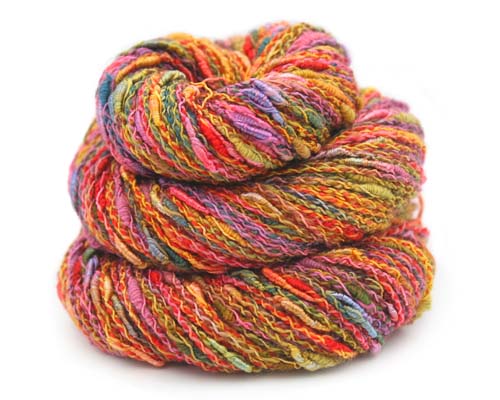 by a striped fabric created by alternating 2 rows each of Blink, a cotton with a spot of metallic and Cin Cin, a textured multi colored slub yarn